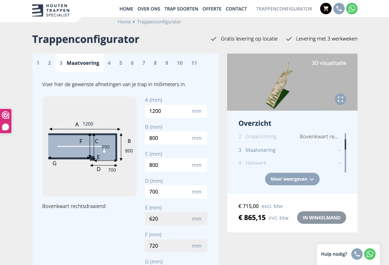 Het product vind je in de trappenconfigurator. Een trap als basisproduct dat is uitgewerkt in een enorme variatie. Pas op het moment dat alle 11 de stappen ingevuld zijn, kan de gekozen trap in het winkelmandje geplaatst en afgerekend worden. Gedurende de stappen wordt de betreffende trap gevisualiseerd in 3D aan de hand van de keuzes die gemaakt worden. Zo is de trap continu in beeld.